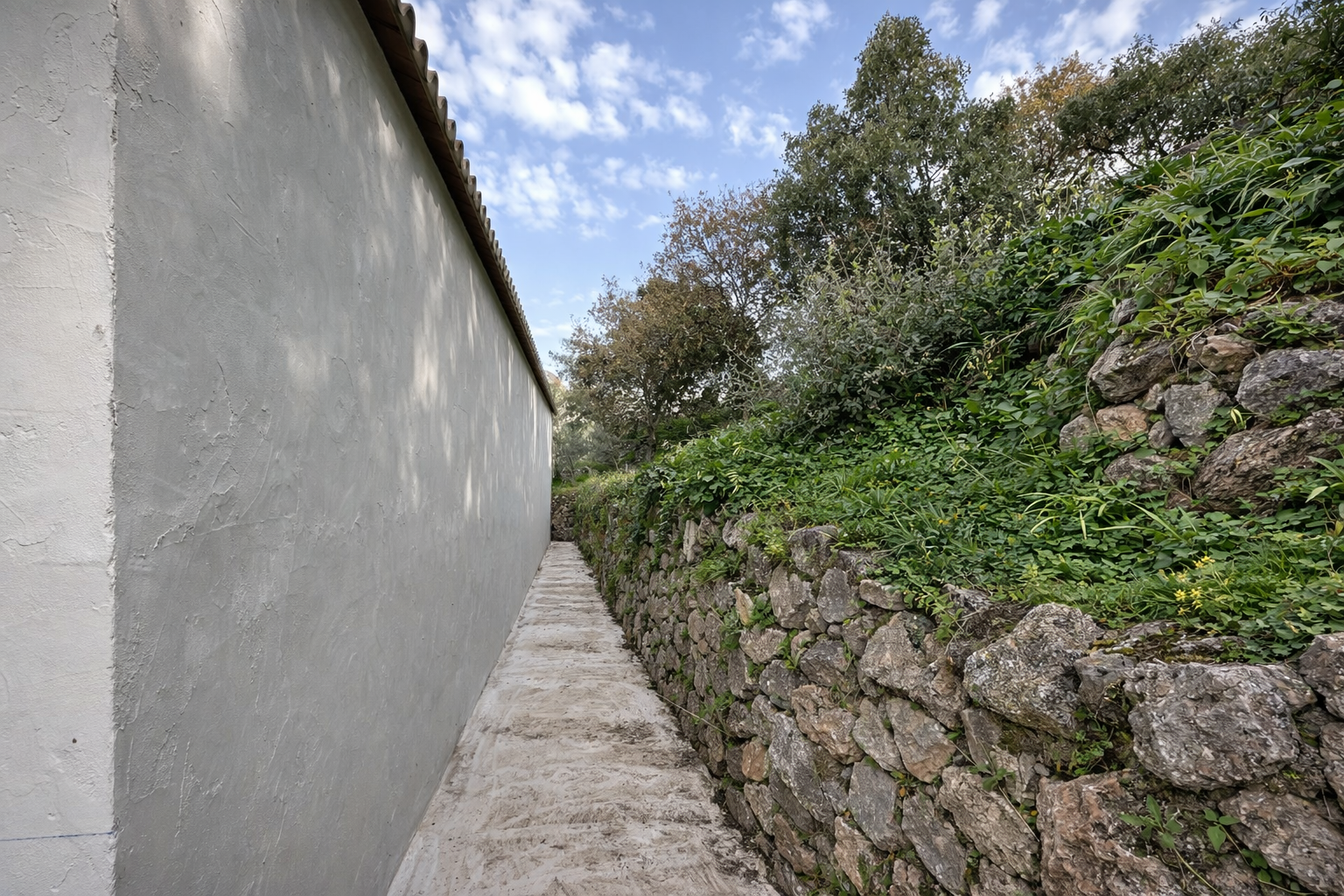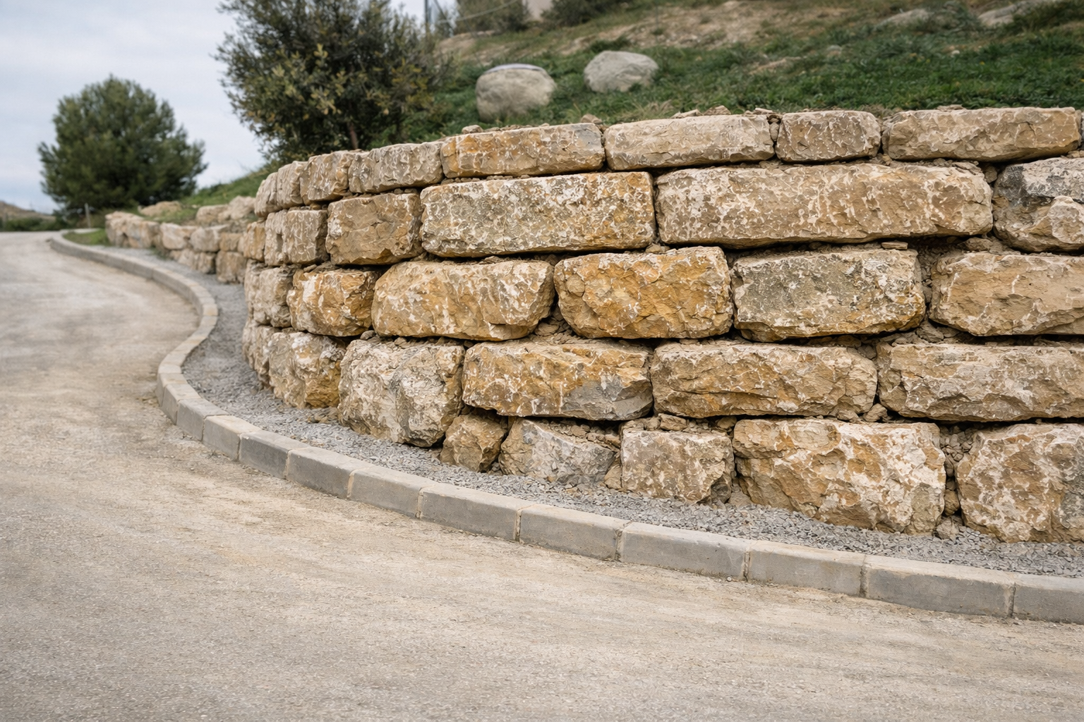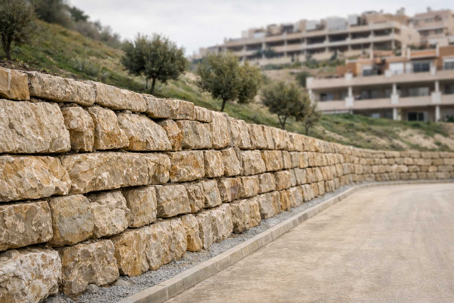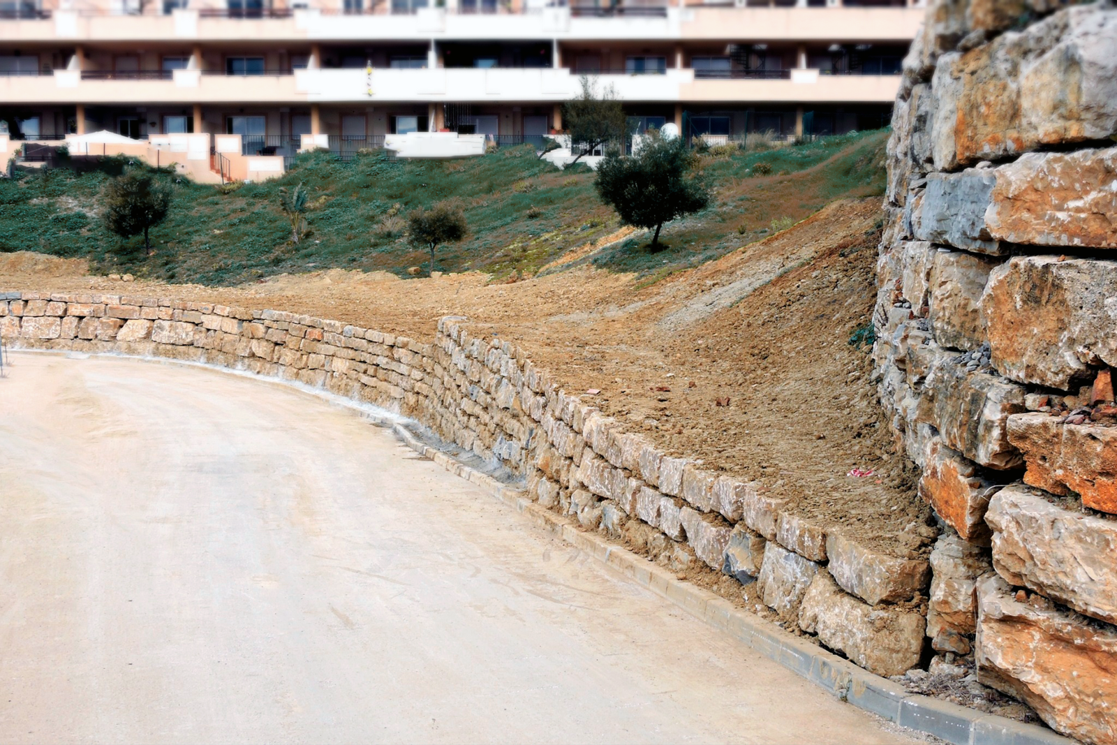 Obra nueva de muro de escollera ejecutado para estabilización de talud en urbanización residencial. Casares.